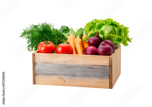 Freshly harvested vegetables in a rustic wooden crate on transparent background, PNG