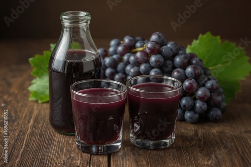 Freshly made grape drink in a bottle and two glasses with a cluster of dark grapes behind, set on a rustic wooden surface, horizontal shot.