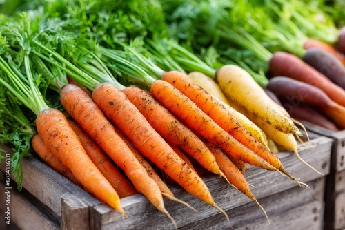 carrot, fresh, market, farm, produce, vegetable, food, healthy, agriculture, organic, garden, harvest, local, natural, raw, ripe, vitamin, root, orange, yellow, purple, colourful, variety, display, wooden crate, box, farmer, farming, healthy eating, nourishment, ingredient, vegetarian, vegan, seasonal, closeup, vibrant