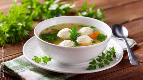 Freshly prepared soup with dumplings, garnished with parsley, served in a white bowl on a wooden table, showcasing vibrant colors and inviting textures for culinary delight