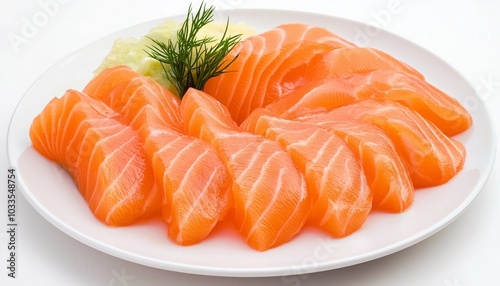 Freshly sliced salmon sashimi arranged elegantly on a plate, garnished with dill and lettuce, showcasing vibrant orange color.