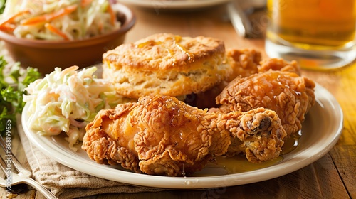 Fried chicken and biscuit with a drizzle of honey, served on a rustic wooden table with a side of coleslaw