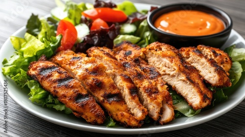 Fried chicken nuggets paired with colorful salad and dips create an inviting presentation on a wooden surface