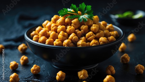 Fried chickpeas seasoned with turmeric, served with parsley and lime on a black plate over an old black tabletop.
