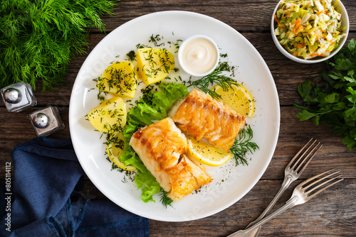 Fried codfish loin boiled potatoes and fresh vegetable salad on wooden table