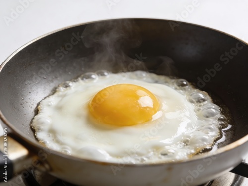 Fried egg with a golden yolk sizzling in a black frying pan on a stove, steam rising, showcasing the cooking process in a kitchen setting