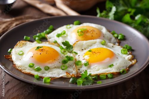 fried eggs with fresh green onions. close-up. chicken egg meal, protein-rich breakfast. cooking at home.