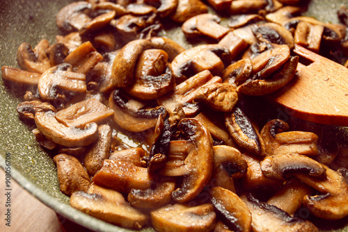 fried mushrooms in a frying pan, with a wooden fork, homemade, no people,
