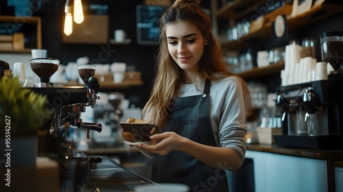 barista, hot drink, cafes, shop, female, client, university, student, part-time, serving, work, beverage, espresso, latte, cappuccino, tea, smile, interior, table, chair, decor, cosy, warm, ambience, atmosphere