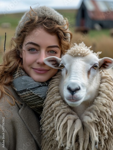 sheep, woman, countryside, interaction, rural, agriculture, smiling, nature, cloudy, animal, farm, portrait, coiffure, sweater, warmth, scenic, greenery, farm animal, landscape, domestic, charme, wool, friendship, girl, beauty, pastoral, joyful, personality, cute, quaint, serene, weather, rustic, lifestyle, calmness, country, life, environment, companionship, lamb, animal