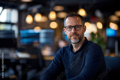 Friendly IT Professional in a Warmly Lit Office, Sitting by Workstations with Code on Monitors