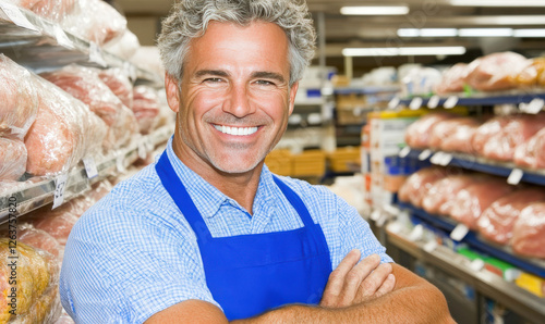 grocer, grocery, shop, store, male, man, grey hair, smiling, apron, fresh, meat, section, quality, product, retail, customer service, food, market, inventory, cheerful, professional, business, merchandise, convenient, shopping, men at work, friendly, produce, display, assistance, life events, service, sale, health, fresh food, economy, management, culinary, clean, aisle