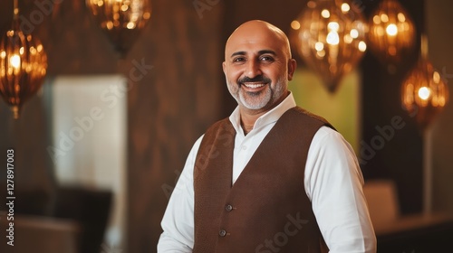 Friendly Omani waiter in his 40s smiling warmly in a luxurious hotel interior, dressed professionally in a white shirt and brown vest.