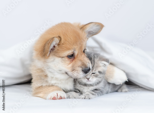 Friendly Pembroke Welsh corgi puppy hugs tiny kitten under warm blanket on a bed at home