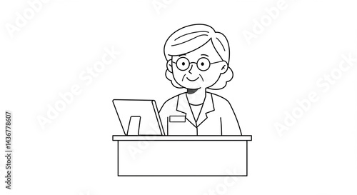 receptionist, desk, tablet, smiling, monochrome, office, working, young, female, professional, business, technology, customer service, mixed race, cheerful, engaged, work, interaction, cooperation, service, communication, occupation, assist, help, casual attire, white background, simplistic, line art, outline, drawing, illustration, vignetting, character, design, modern, concept, people, workplace, friendly, caring, approach, hospitality, service industry, office space, support, collaboration