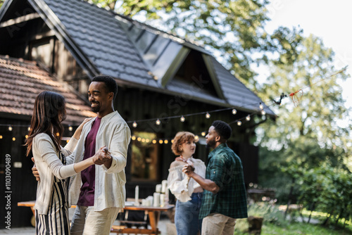 Friends enjoying a multiracial party dancing in the backyard of a country house
