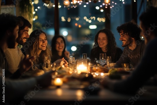 friends, group, dinner, table, candlelight, light, night, laughing, smiling, happy, conversation, gathering, together, close, intimacy, casual attire, relaxed, warm, cosy, home, celebration, joy, festive, party, indoor, eatery, food, drink, goggles, wine, eating, sharing, closeup, blurry, sharpened