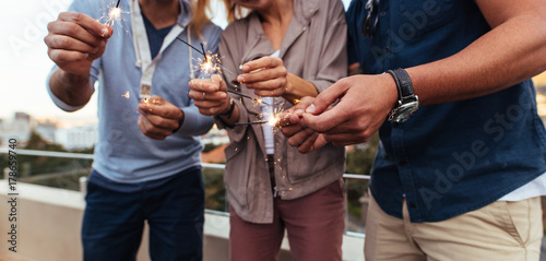 celebrate, celebration, close, cropped, eve, female, fireworks, friends, group, hand, holding, horizontal, lifestyle, male, man, man, mid, new, outdoors, party, people, rooftop, section, sparkler, three, up, woman, woman, year, young