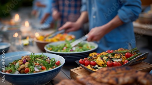 Friends setting up an outdoor barbecue, preparing a colorful spread of fresh salads and grilled vegetables, looking forward to a delightful evening filled with good food and laughter. cinematic