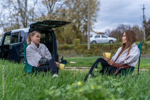 woman, friends, travel, road trip, camping, conversation, talking, relaxing, outdoors, nature, blanket, hot drink, tea, mug, autumn, fall, spring, leisure, vacation, lifestyle, picnic, greengrass, chair, van, vehicle, suv, adventure, journey, get-away, casual attire, enjoying, weekend, togetherness, half face, two people, car, freedom