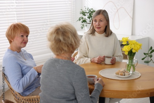 Friendship. Senior women enjoying hot drinks at table indoors