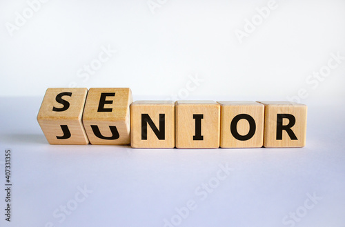 From junior to senior symbol. Turned cubes and changed the word 'junior' to 'senior'. Beautiful white background, copy space. Business and junior or senior concept.
