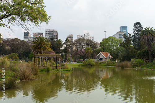 From the Ecoparque you can see a greenish lagoon with grass around it and trees in the background that cover the buildings of the city of Buenos Aires.