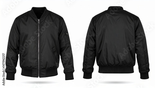 jacket, bomber, black, fashion, apparel, clothing, style, outerwear, front, back, casual attire, design, textile, fabric, zip, sleeve, collar, cuff, pocket, zip, wear, garment, trend, modern, urban, clothes rack, elegant, unisex, blank, template, isolated, background, white, studio, shot, photoshoot, presentation, display, nobody, nylon, polyester, material, texture, ribbed, elastic, comfortable, lightweight