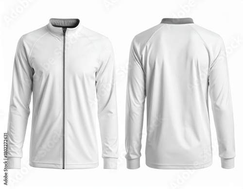 jacket, white, clothing, apparel, fashion, wear, garment, textile, fabric, outerwear, long sleeve, zip, collar, front view, backview, studio shot, plain, minimalist, clean, modern, sleek, athletic, activewear, casual attire, menswear, unisex, basic, style, clothes rack, item, merchandise, presentation, isolated, white background, cut-out, professional, design, template, uniform, activewear, zip, layered, top