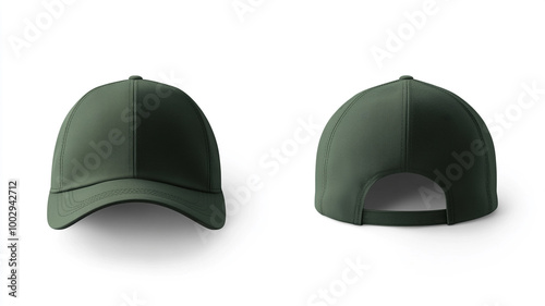 front and back view of green baseball cap on a white background. - Mock-up template for design presentation.