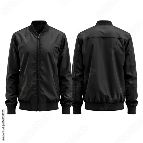 jacket, black, bomber, apparel, clothing, fashion, style, attire, outerwear, garment, texture, fabric, polyester, nylon, lightweight, zip, ribbed, cuff, collar, silhouette, detail, front, back, perspective, design, template, blank, isolated, studio, neutral, solid, uniform, simple, classic, modern, unisex, casual attire, everyday, practical, versatile, smooth, glossy, clean, outfit, wearable, stylish