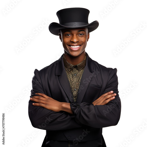 Front view of an extremely handsome black african male model dressed as a Magician smiling with arms folded, isolated on a white transparent background.