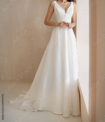 Front view of beautiful bride dressed in a white long wedding dress with deep neckline. Classic wedding sleeveless dress