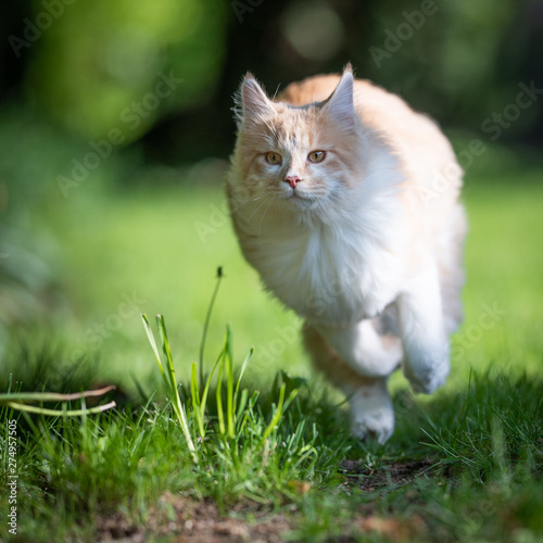 front view of fluffy beige white maine coon cat running on green grass in the back yard at high speed on a sunny summer day
