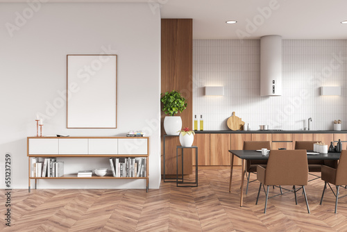 kitchen, interior, room, copy space, canvas, poster, banner, tile, wall, dining, table, armchair, cupboard, modern, contemporary, sideboard, template, frame, empty, minimalist, style, front, view, sink, design, comfortable, mock, up, white, oak, wooden, hardwood, floor, flat, apartment, house, home, bright, concept, cosy, shelf, book, decoration, no people, three-dimensional, rendering, render
