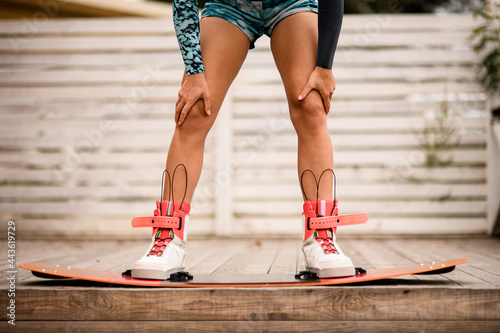 action, athletic, attach, beautiful, blurred, board, boarding, boot, bright, colourful, cool, equipment, female, fit, fix, fixed, front, front view, hand, holiday, joy, leg, leisure, pair, pink, resort, river, shoe, special, sport, sports equipment, sporty, summer, summer, swimwear, swimwear, tightening, training, vessel, vibrant, view, wakeboarding, white, woman, wooden, young