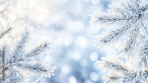 Frost covers the pine branches, glistening in the gentle morning sun, while a peaceful winter atmosphere envelops the surrounding landscape