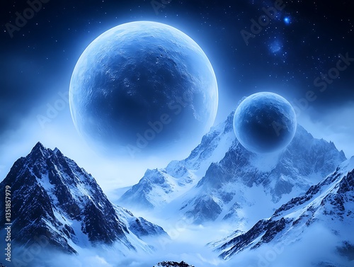 celestial, cosmic, fantasy, futuristic, galaxy, ice, landscape, moon, moon, mountain, night, planetary, science fiction, science fiction, space, spaceship, star, starry, surreal, universe, winter, earth, aethereal, mystical, dreamscape, cold, glacé, icy, snowy, majestic, peak, peak, nebula