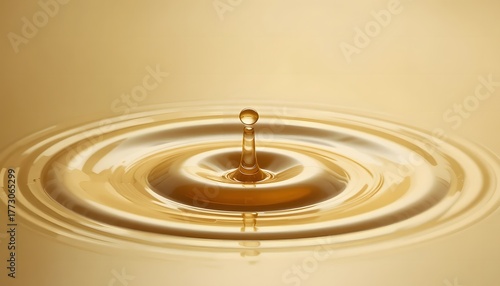 Fuel drop forming ripples on smooth golden liquid surface.