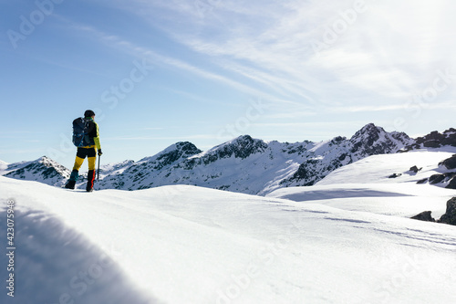 traveler, mountaineer, snow, man, rock, active, climber, sunlight, nature, freedom, male, activewear, backpack, mountain, landscape, sunny, winter, travel, activity, lifestyle, adventure, tour tourism, wanderlust, highland, ridge, explore, backpacker, range, rough, recreation, environment, discovery, extreme, climb, outerwear, enjoy, explorer, altitude, wild, destination, white, alone, unrecognizable, full-length, full body, backview, looking away, outdoors, anonymous