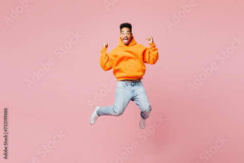 Full body exultant young man of African American ethnicity he wearing yellow hoody casual clothes jump high do winner gesture isolated on plain pastel light pink background studio. Lifestyle concept.