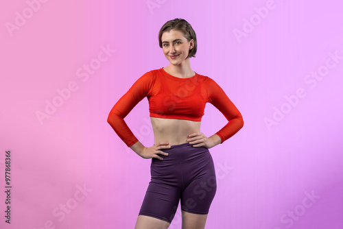 isolated, portrait, background, exercise, fitness, healthy, lifestyle, sport, woman, fit, athlete, physical, power, athletic, strong, activewear, studio, shot, model, health, energy, gym, active, positive, relax, wellness, well-being, body, cardio, endurance, posture, pose, strength, full body, happy, smile, healthy lifestyle, person, people, female, young, posing, shoe, pink, confidence