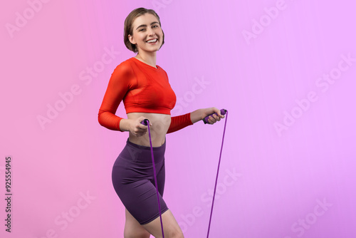 rope, jumping, isolated, background, exercise, fitness, healthy, lifestyle, sport, woman, fit, athlete, physical, power, athletic, strong, activewear, studio, shot, model, health, energy, gym, active, positive, relax, wellness, well-being, body, endurance, ball, portrait, full body, cardio, posture, healthy lifestyle, person, people, young, posing, skipping rope, skipping, jumping rope, pink, female