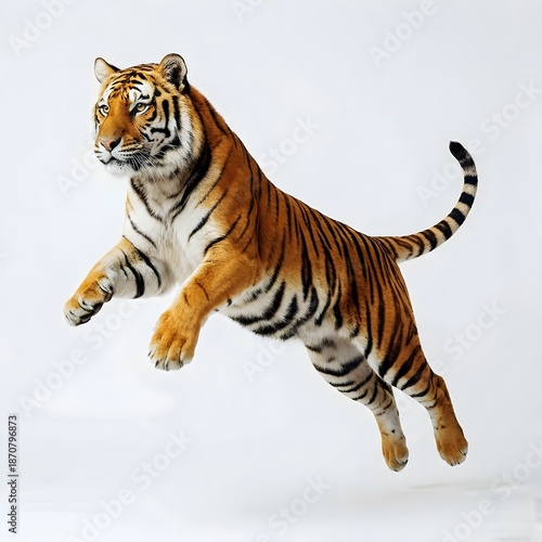Full body of a majestic tiger jumping and floating mid-air isolated on white background