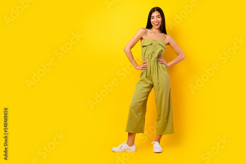 Full body photo of adorable cheerful malaysian person put arms waist posing isolated on yellow color background