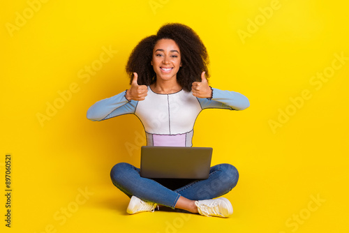 Full body photo of attractive young woman sit floor netbook thumb up dressed stylish blue clothes isolated on yellow color background