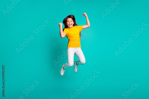 Full body photo of delighted kid girl jump high raise fists wear white pants yellow t-shirt isolated over teal color background