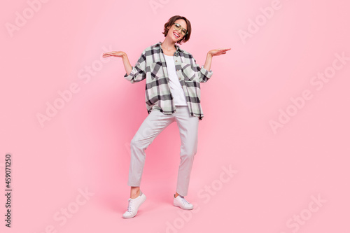 Full body photo of funky young brunette lady dance wear eyewear shirt trousers sneakers isolated on pink background