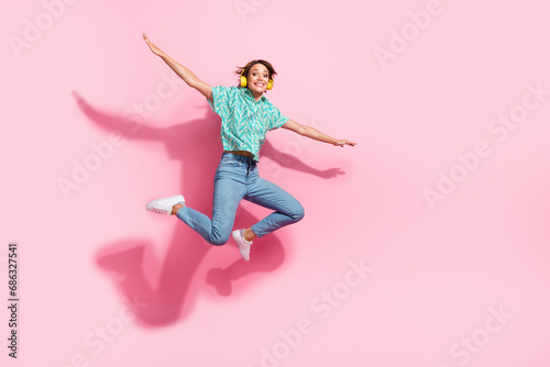 Full body photo of overjoyed excited lady jump arms wings fly empty space ad isolated on pink color background
