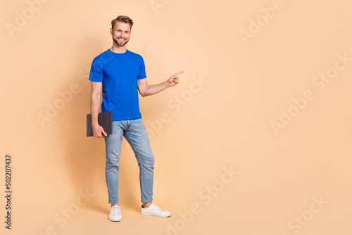 Full body photo of positive person indicate finger empty space proposition isolated on beige color background